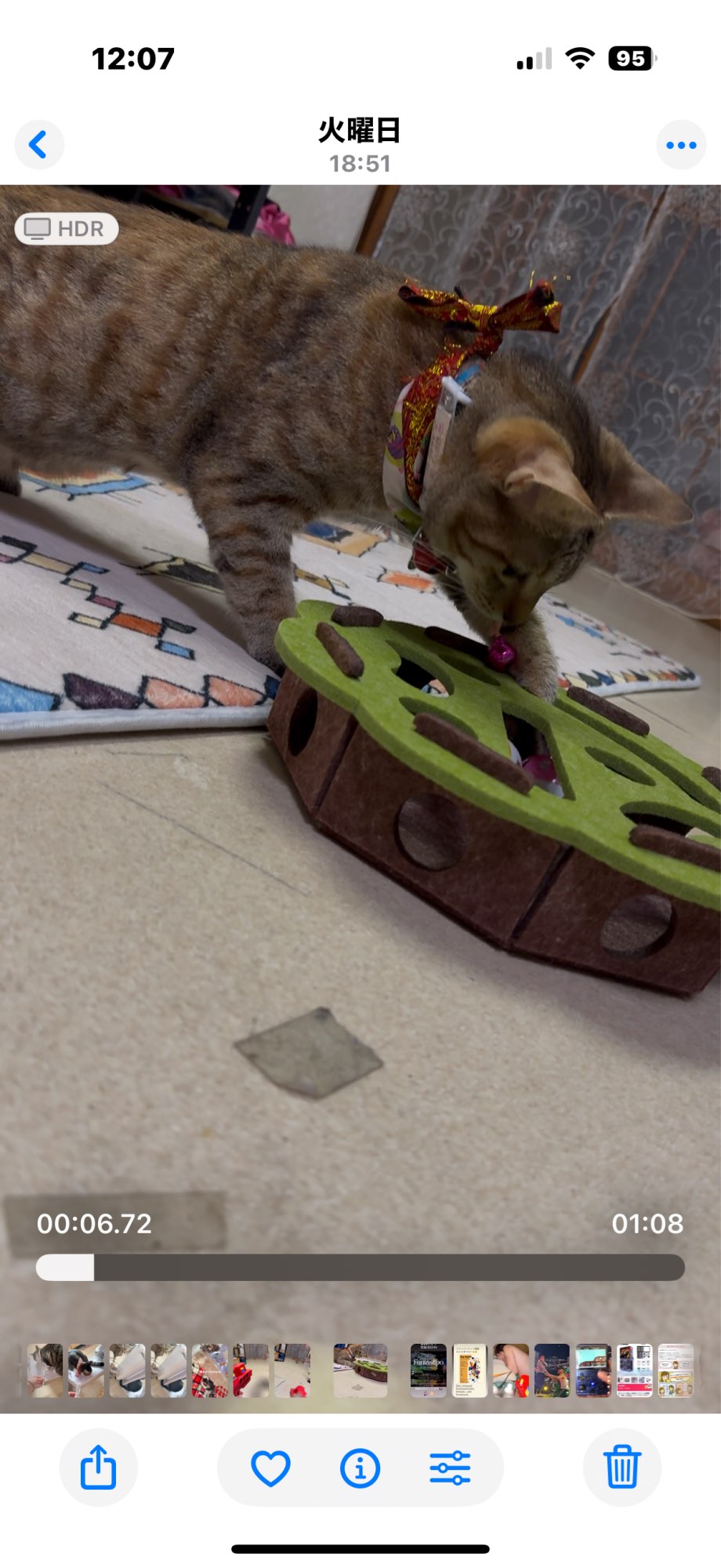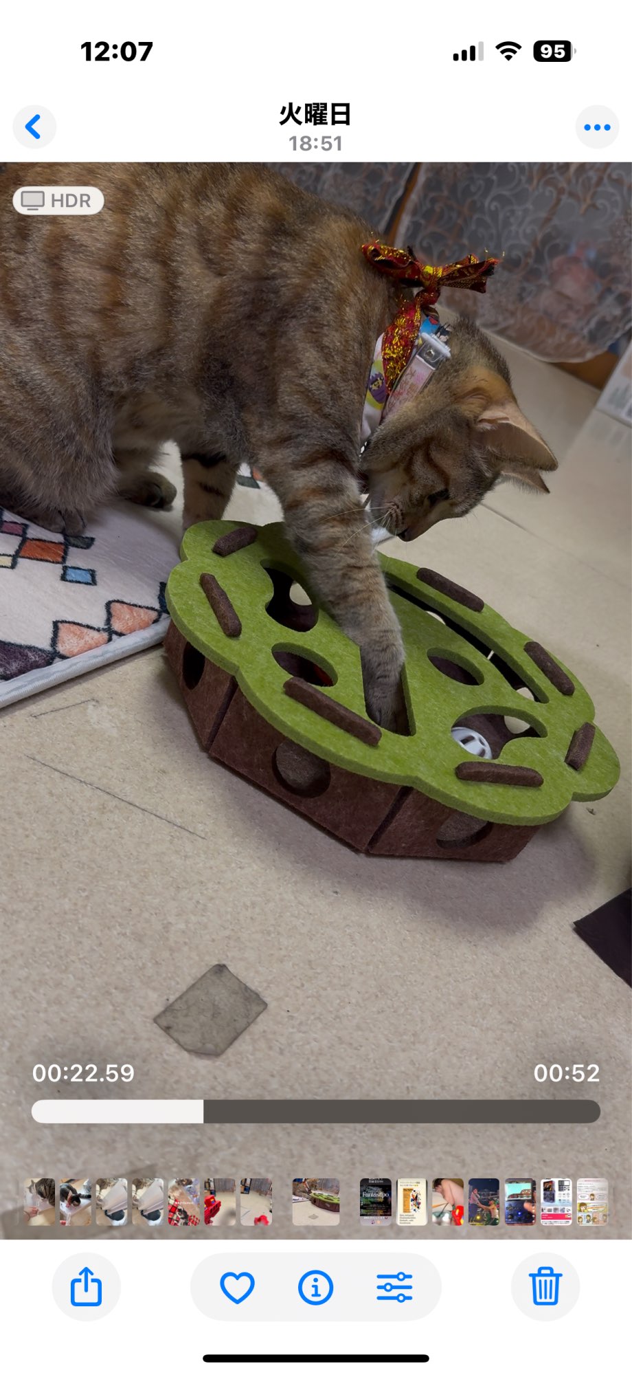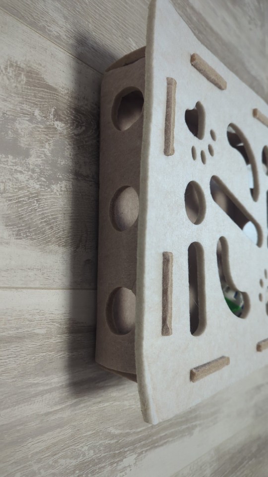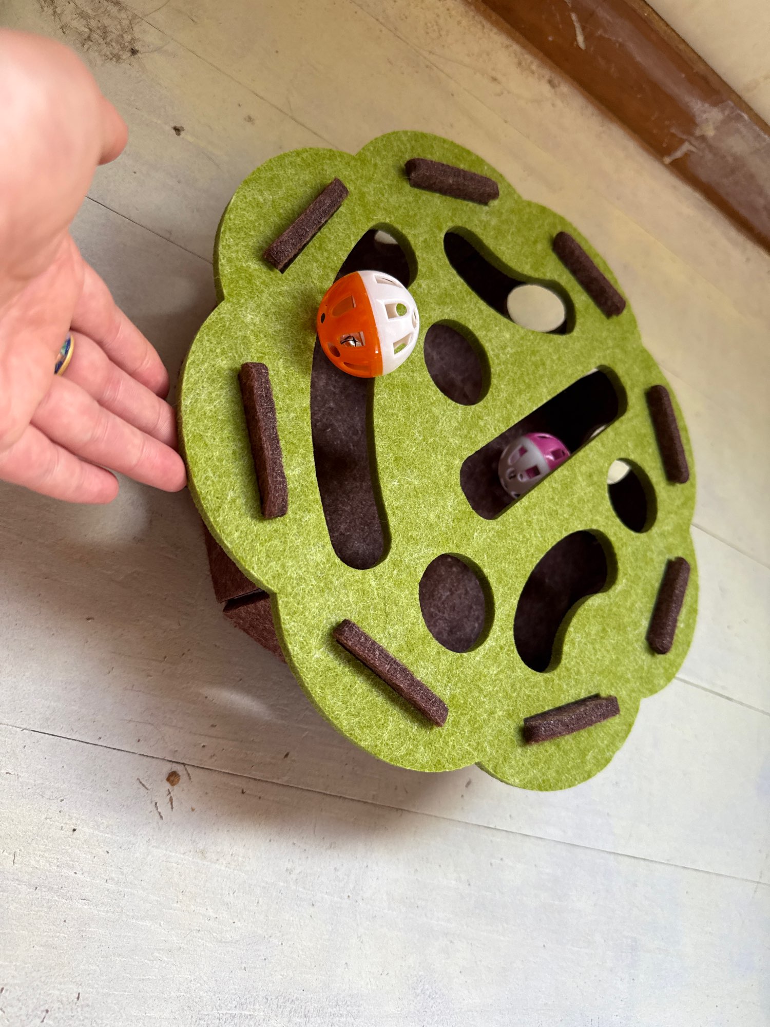 It's made of soft felt fabric with a core, looks cute in both appearance and color, and the ball makes a cute sound when rolled!