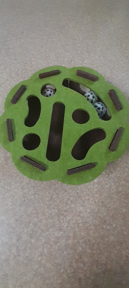 The product is neither too big nor too small, it is light. Moreover, it is made of felt and very pretty. My cat plays a lot with it trying to get the balls inside.