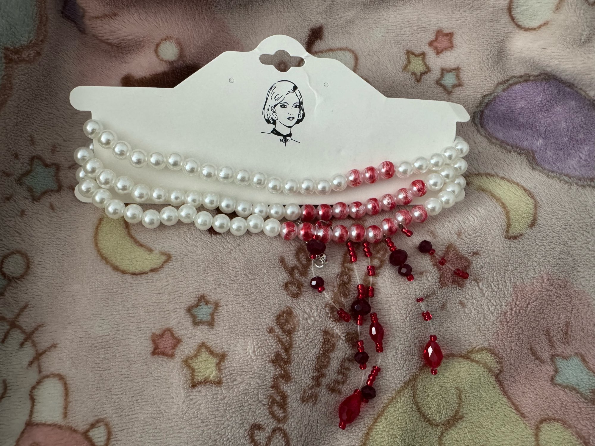 The overall style of this necklace can be described as unique, edgy, and Gothic, with its dripping blood imitation pearl design perfect for Halloween or vampire-themed costumes. The necklace looks beautiful and realistic, with the blood drops adding a fun and creepy touch, which aligns with the vampire costume theme. The dripping blood pearl design adds an eerie and spooky touch to any outfit, enhancing the wearer’s gothic or Halloween-inspired look. The unique and eye-catching style of this necklace is sure to draw compliments and admiration!
