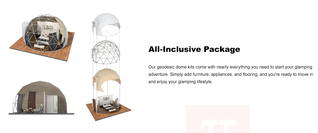 The Luxury Glamping Geodesic Dome Tent is a premium outdoor retreat that seamlessly blends modern comfort with the natural beauty of the outdoors. Designed with a sturdy, weather-resistant frame and panoramic windows, this dome offers a spacious, stylish, and eco-friendly shelter for luxury camping. Ideal for resorts, retreats, or private getaways, it features customizable interiors, excellent ventilation, and all-season durability. Whether under the stars or surrounded by mountains, the Luxury Glamping Geodesic Dome Tent provides an unforgettable glamping experience in comfort and style!