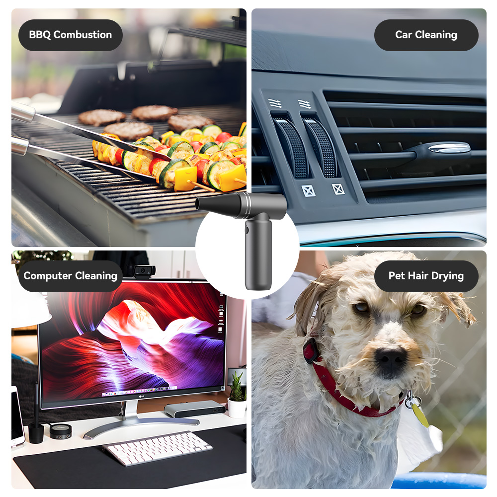 A booster air blower blows immediately and continuously high-pressure air to clean dust, debris, and dirt away from any electronic device in your home or office, such as a computer, keyboard, laptop, car, camera, coffee machine, printer, etc. Essential for outdoor activities, the jet fan can dry shoes and socks, clean picnic mats, blow air when making a fire outdoors, and blow smoke when grilling; essential for photography.
