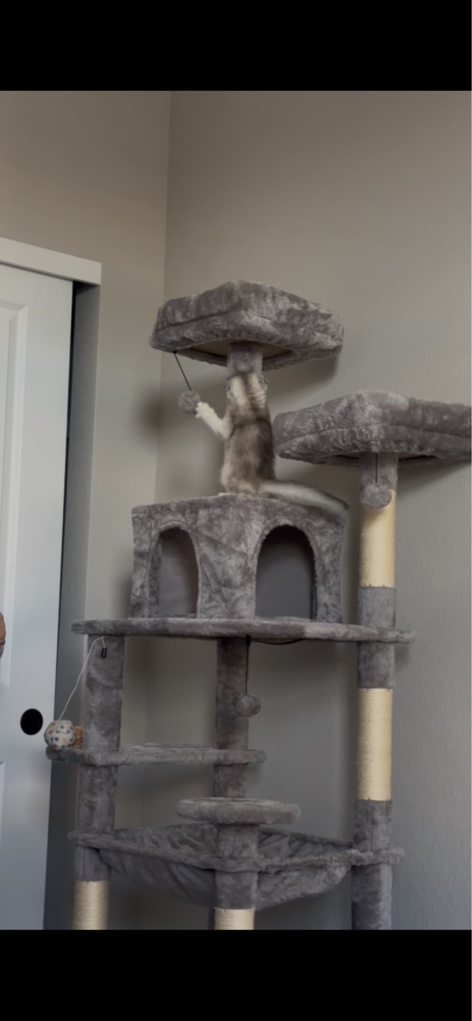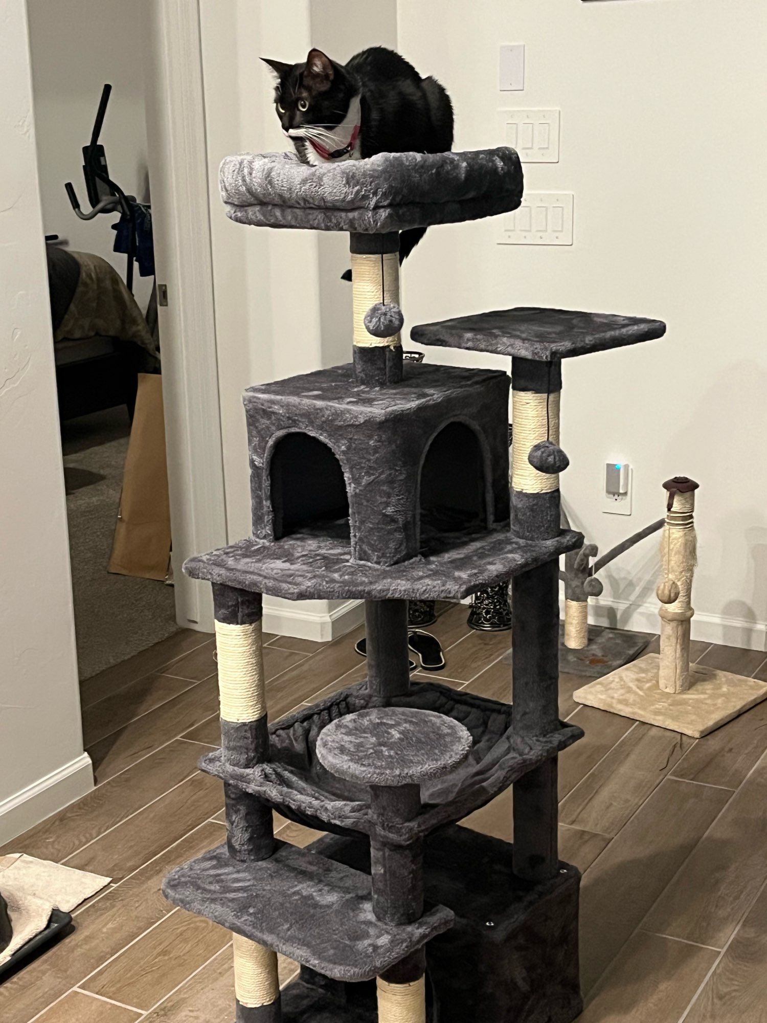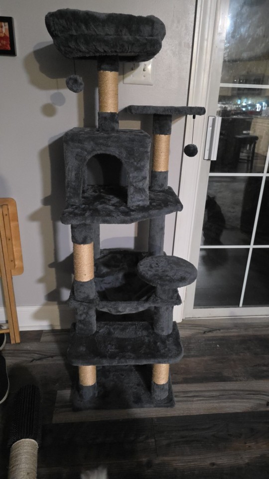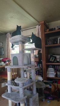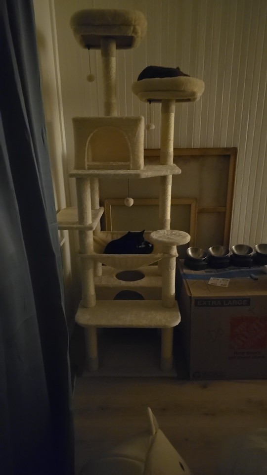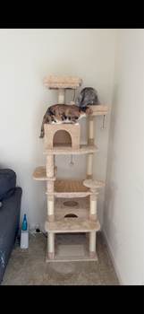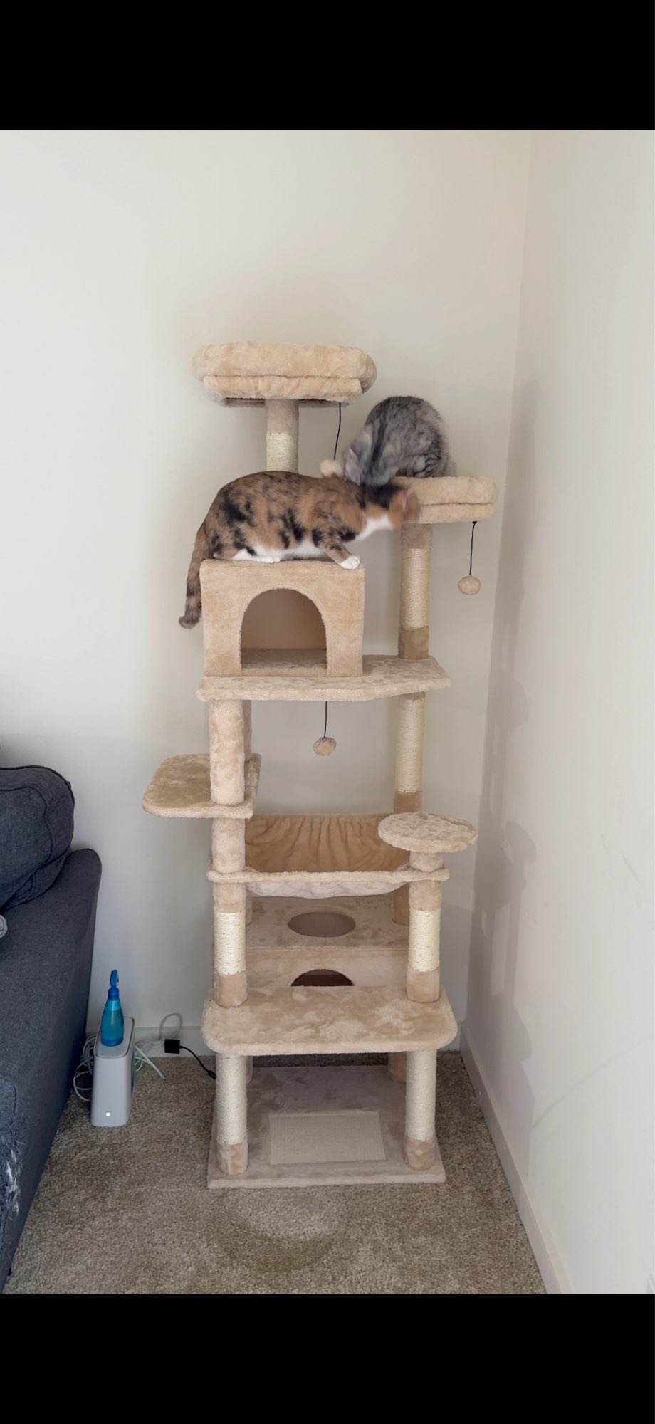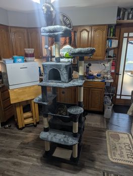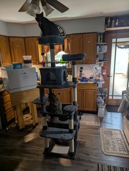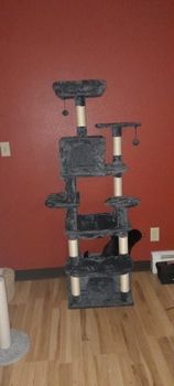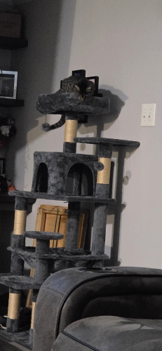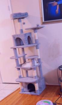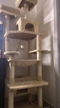 I just moved into a new house. I'm still unpacking and getting things set up. I had to buy a new cat tree since i have adopted another cat, making the total 5 cats. This tree has enough space for all 5 cats. I am very pleased with this purchase.