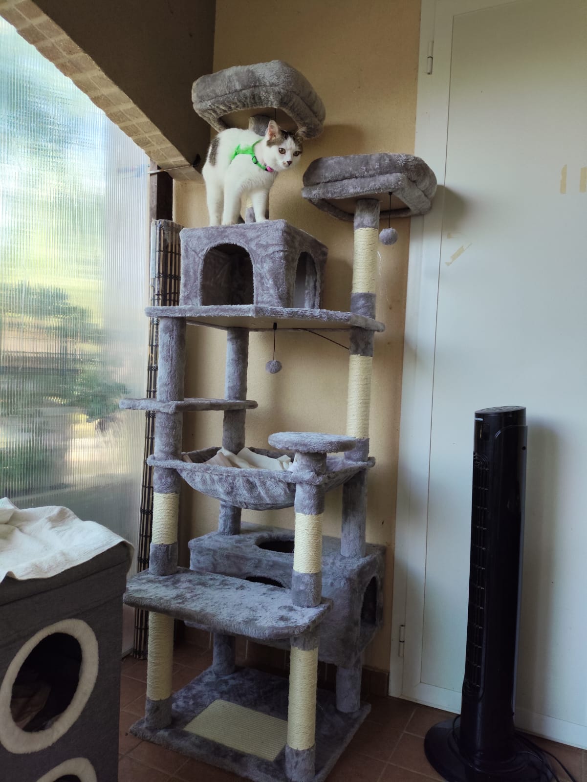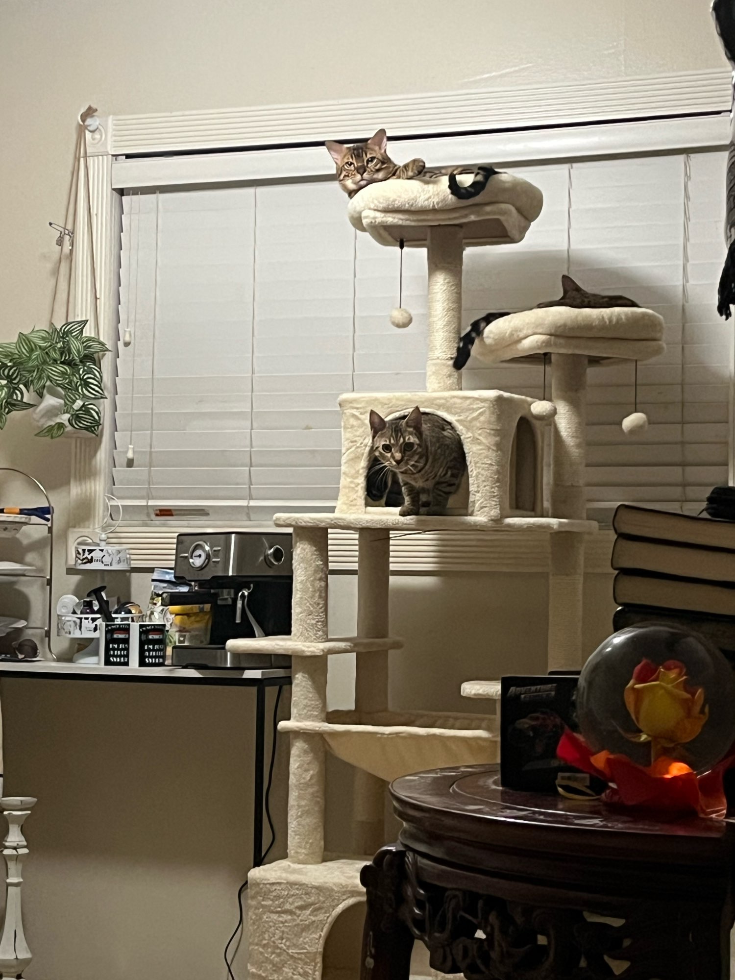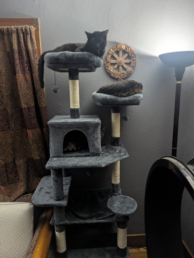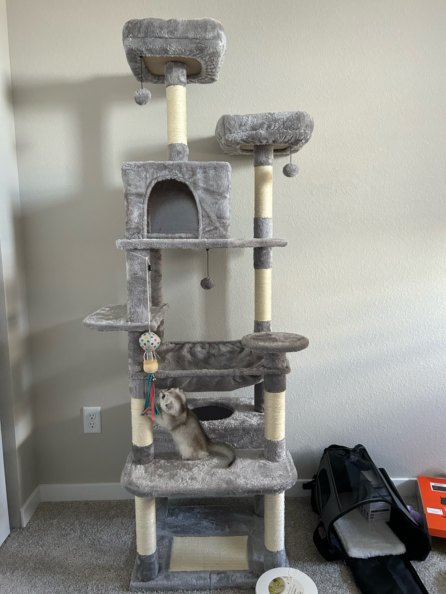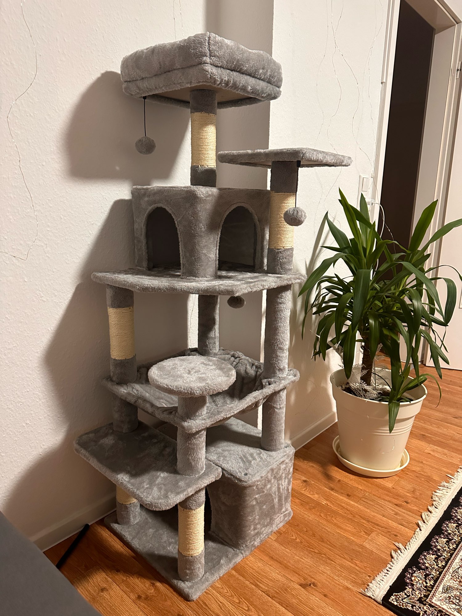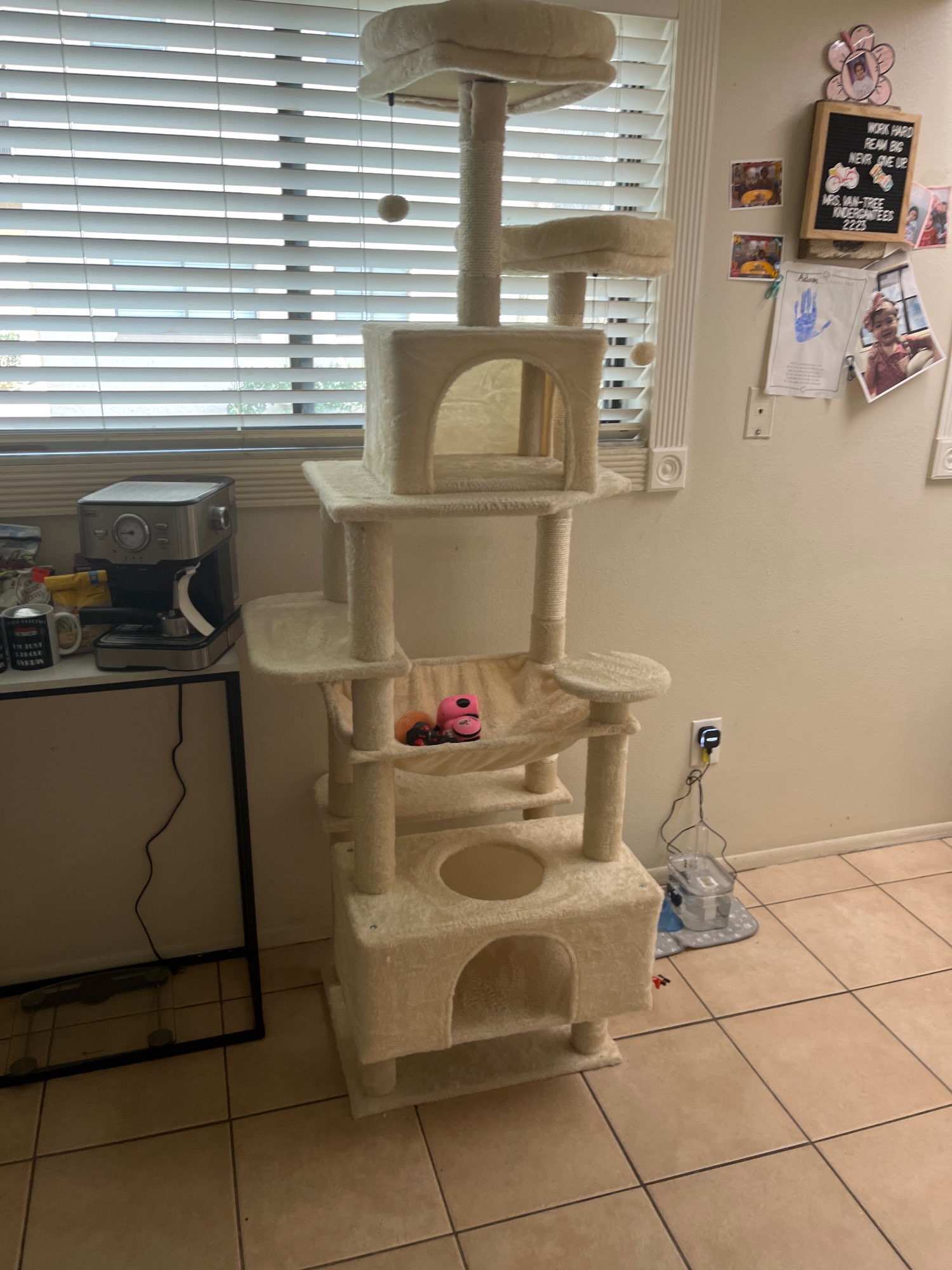I just moved into a new house. I'm still unpacking and getting things set up. I had to buy a new cat tree since i have adopted another cat, making the total 5 cats. This tree has enough space for all 5 cats. I am very pleased with this purchase.