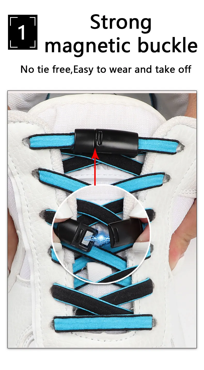 These No-Tie Magnetic Elastic Shoe Laces feature a unique curved magnetic buckle and flat elastic rope design. The magnetic and snap-on double-lock design of the lock ensures that your shoelace will never loosen. The lace locks are curved and fitted with a flat stretch cord that blends perfectly with your feet to keep them comfortable all day. Easy to use. Putting on shoes could not be easier. Slip on/Slip off, these elastic shoe laces are quick and easy!