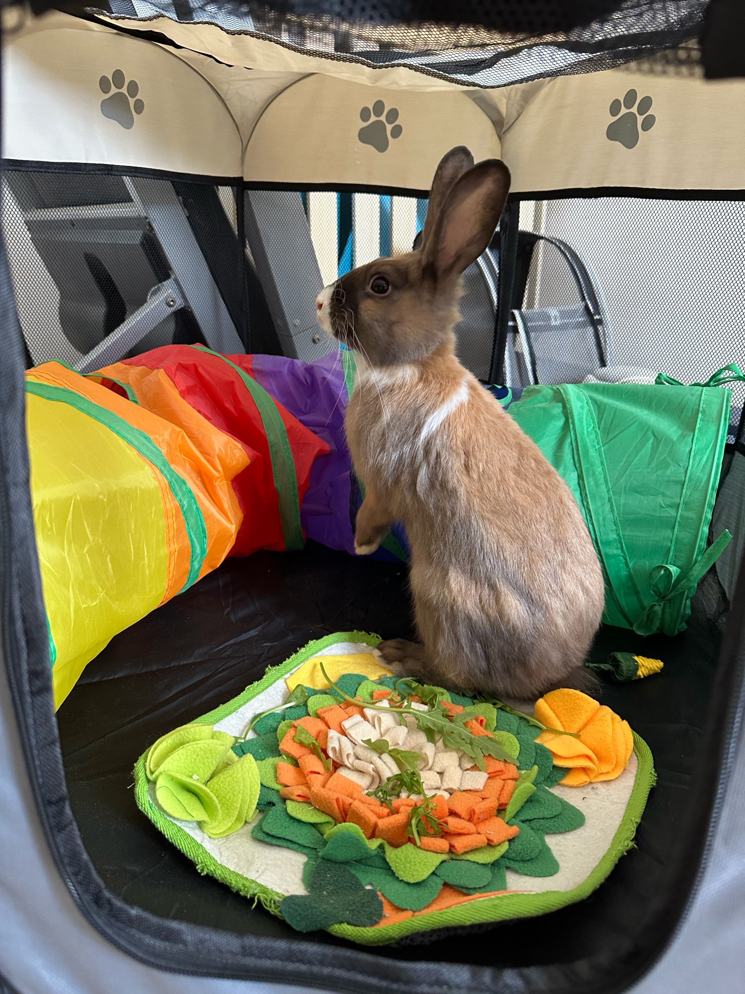 My bunny loves it! I recommend getting the biggest size for a cat or dog so they have room to hang out