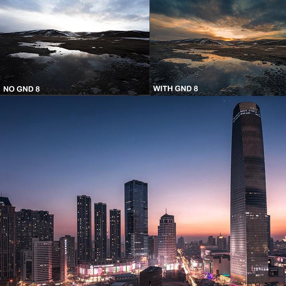 Suitable for a big contrast of light ratio between the sky and the ground, if the ground exposure is normal, the sky will be seriously overexposed, soft GND filter can effectively balance the light ratio and contrast!
