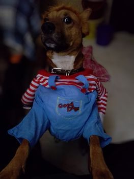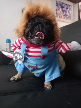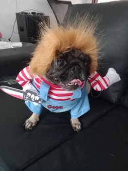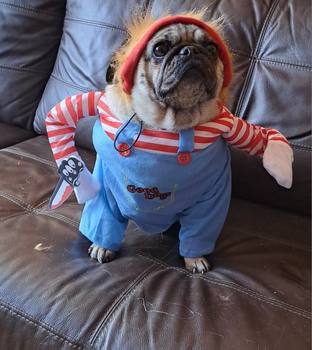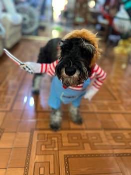 The Chucky dog costume is made of soft, breathable, and skin-friendly cotton and polyester fiber, making it comfortable for your pet. Dressing up your pet in these pet clothes will make your furry baby scarier and cuter. The foam knife is movable, with a magic strap that fixes it to the hand to reduce fear and tension. A good choice, whether for holiday or daily wear. Your dog will be the party’s focus, especially suitable for Halloween birthday parties, masquerade parties, and any other parties!