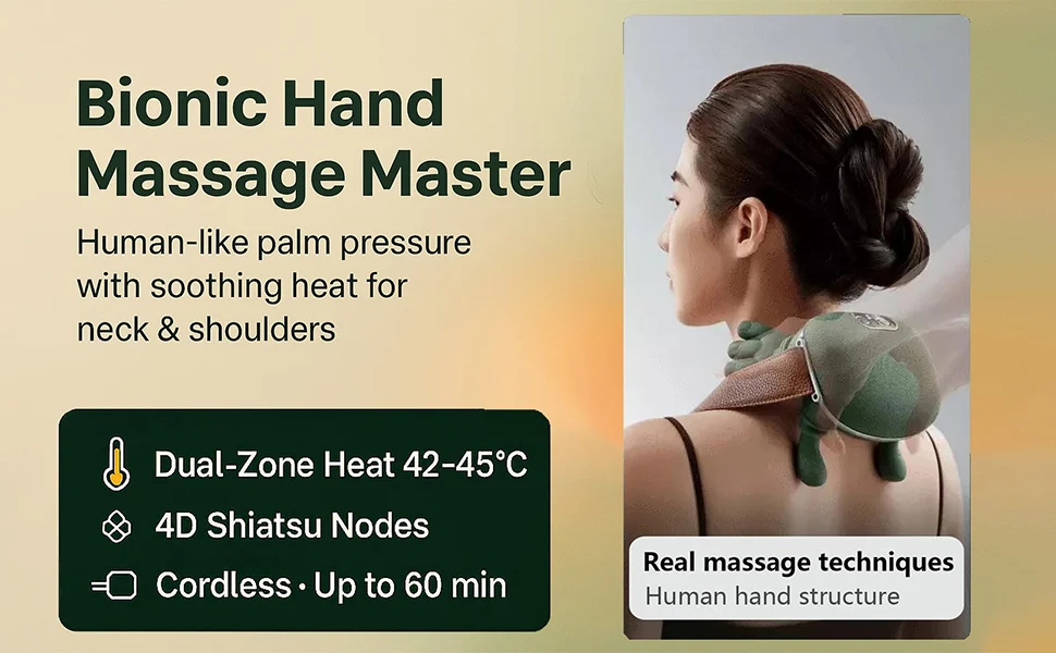 The Electric Bionic Hand Massager provides a 4D Kneading massage to bring you a comfortable massage experience, and relax neck muscle tension. The Neck Shoulder Massager provides soothing heat for relaxation. 2 Heating Levels are adjustable. The Neck Massager is cordless for convenient use. This shoulder massager can last about 70 minutes on a single charge. The Electric Bionic Hand Massager is a great gift for friends and family, a perfect gift for men and women!