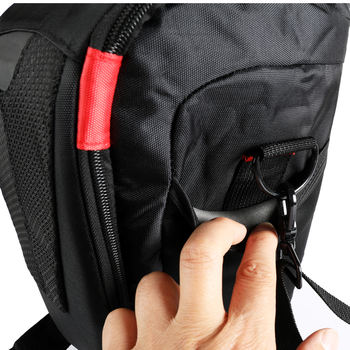 In a pocket on the front of the bag, you can put the battery, memory card, charger, and other accessories.